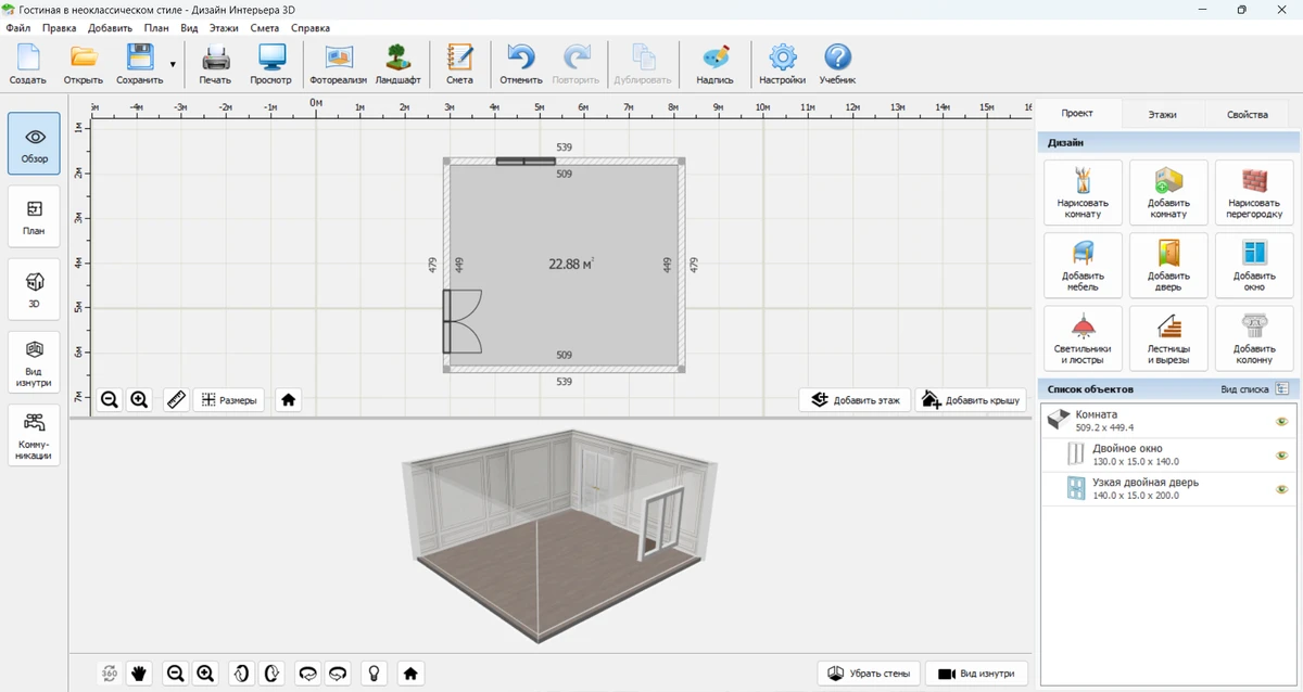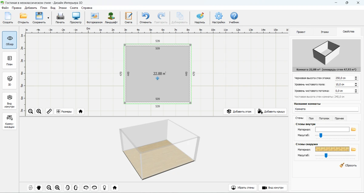 - Шаг 3. Выполняем отделку. Зайдите во вкладку «Свойства», там вы увидите настройки отделочных материалов для стен, пола и потолка. Выберите подходящие в каталоге программы. Вы также можете загрузить собственные варианты, нажав кнопку «Добавить свои материалы». Дополните комнату окнами и дверями. Вы также можете добавить колонны, которые подчеркнут неоклассический стиль.