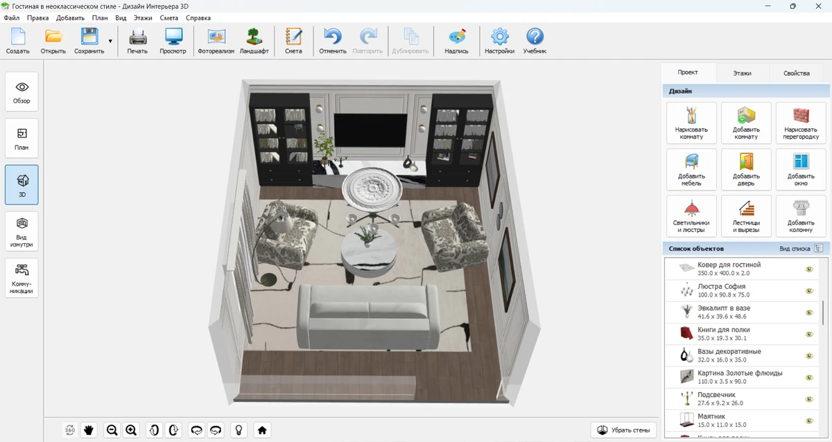 Создавайте свои варианты интерьера в стиле неоклассика вместе с нашей программой. Привнесите в свое жилище весь шик и благородство прошедших эпох, окружите себя классической роскошью в современном обрамлении. Каждый день, возвращаясь домой, вы будете наслаждаться изяществом и гармонией окружающего пространства. А программное обеспечение Дизайн Интерьера 3D поможет продумать все до мельчайших деталей. Создавать дом мечты — это просто!