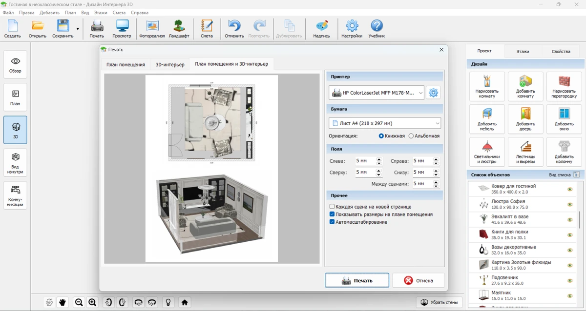- Шаг 5. Сохраняем и печатаем проект. Не забывайте сохранять прогресс работы, чтобы не потерять сделанное. Нажмите на кнопку с дискетой в верхнем меню. Если нужно распечатать проект, кликните по кнопке с принтером.