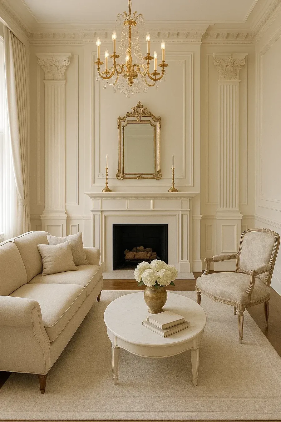 Дизайн неоклассика обычно включает в себя крупные зеркала в изысканных массивных рамах и добавляющие уюта камины.
