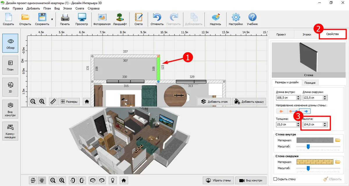Кликните по боковой стене пристройки. Затем откройте вкладку «Свойства».