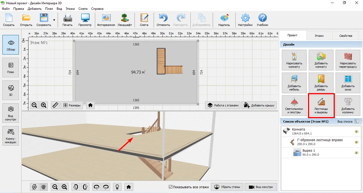 Вернитесь на первый этаж и добавьте лестницу. Над ней автоматически появится вырез — это и будет вход на второй этаж. Если нужно, отредактируйте параметры каждого объекта вручную.