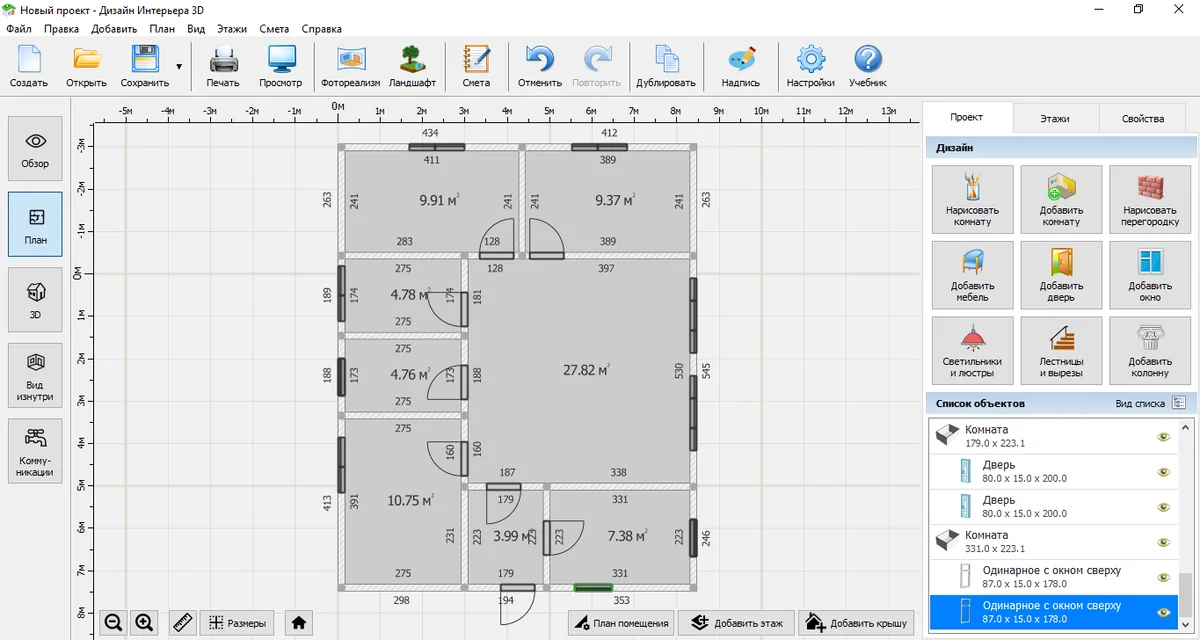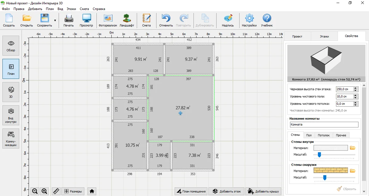 Настройте комнаты во вкладке «Свойства». Там регулируются параметры стен.