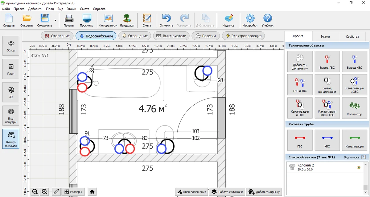 Следующий этап — вкладка «Коммуникации». В ней продумайте водоснабжение, отопление, проложите электропроводку, расставьте розетки и выключатели.