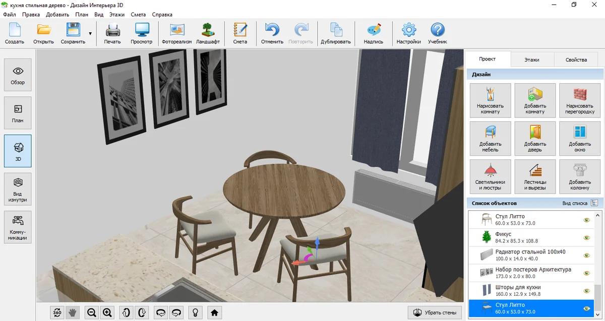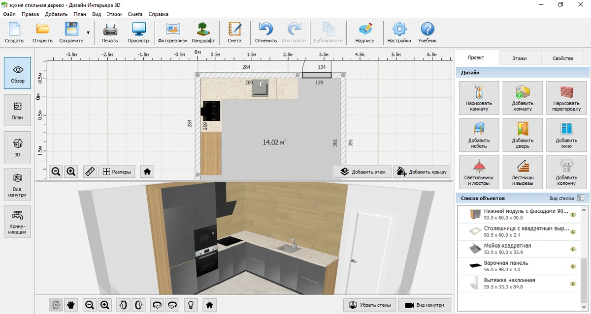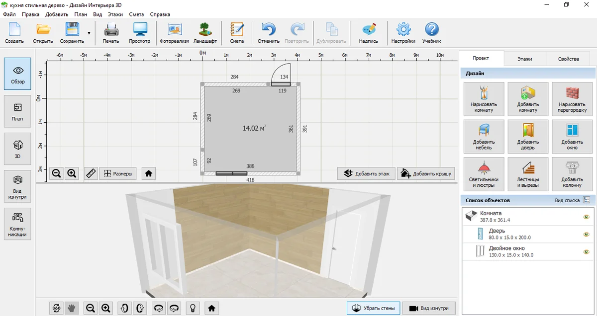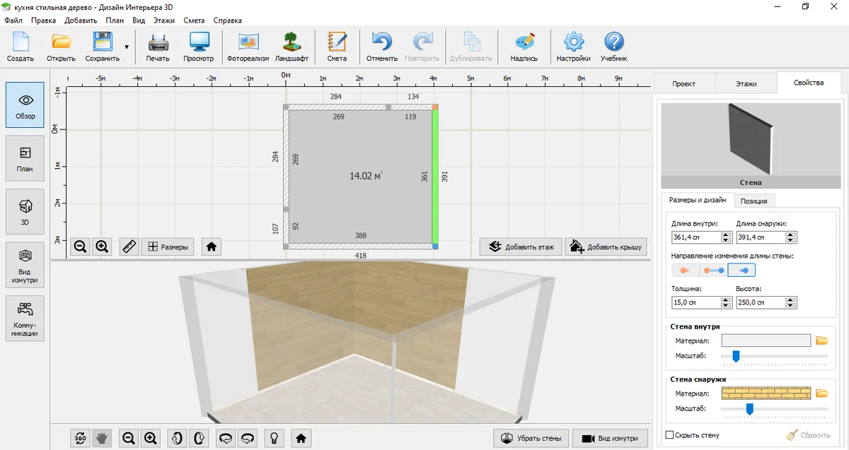 Выделите кухню на плане и перейдите во вкладку «Свойства». Там настройте черновую высоту стен, уровень чистового пола и потолка. Чтобы смоделировать комнату, приближенную к реальной, настройте параметры каждой стены отдельно: длину внутри и снаружи, толщину. Подберите отделку для всех поверхностей.
