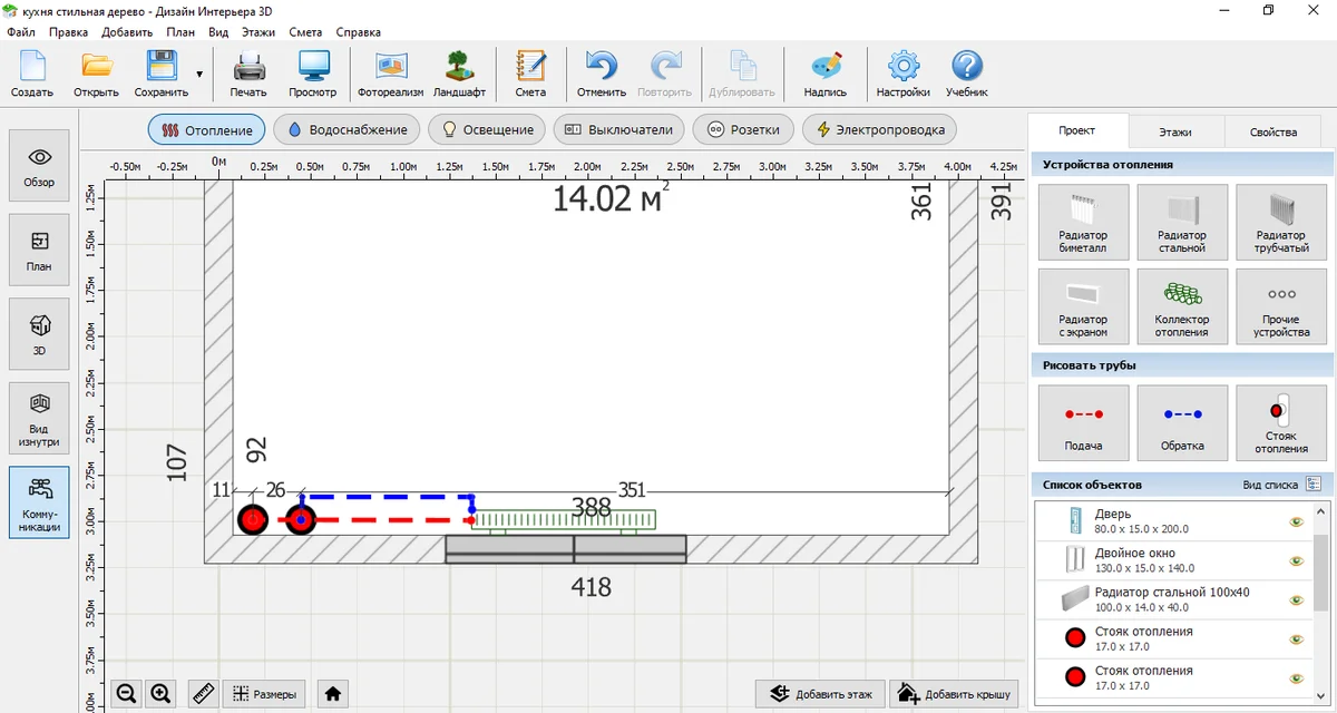 Во вкладке «Коммуникации» расставьте выключатели и розетки, продумайте электропроводку. Проведите трубы отопления, водоснабжения и канализации.