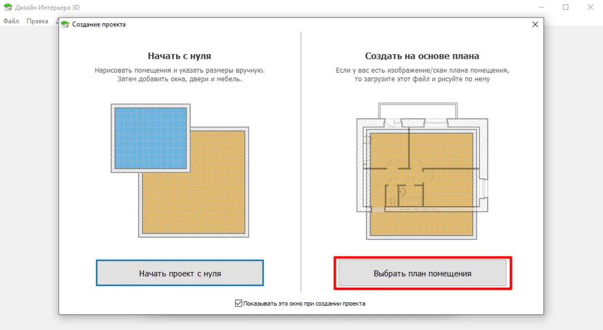 Вам нужна колонка справа — «Создать на основе плана». Нажмите на кнопку «Выбрать план помещения» под чертежом.