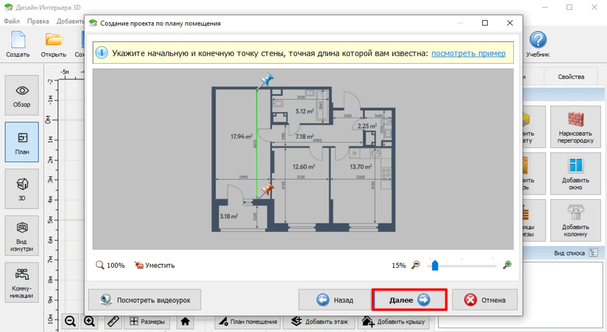 Когда откроется новое окно, дважды кликните мышью и загрузите план квартиры сверху. Укажите начальную и конечную точку стены, длина которой вам известна. Нажмите по кнопке «Далее».