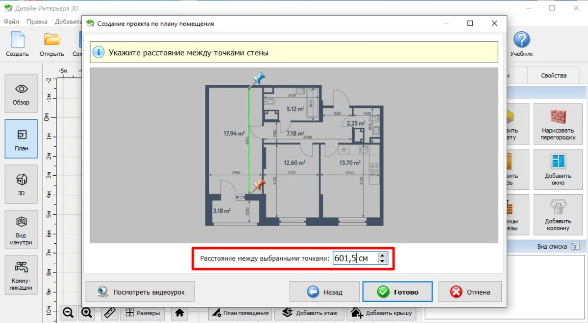 Укажите расстояние между точками, чтобы программа правильно масштабировала чертеж по размерной сетке. Кликните «Готово».