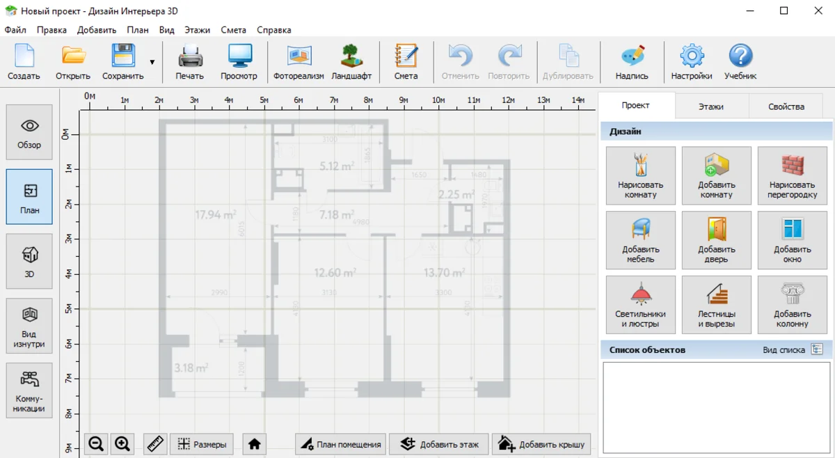 Нажмите кнопку «Нарисовать комнату» и обведите загруженный чертеж, чтобы получить 3Д-проекцию комнат.
